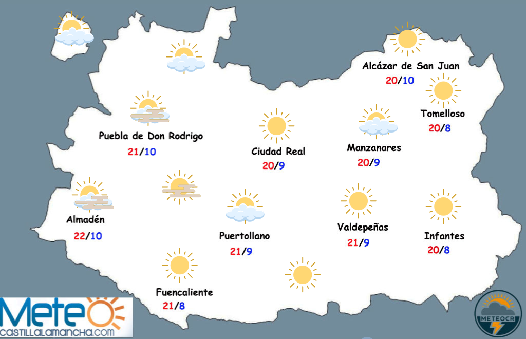 El viento soplará flojo variable, con cierto predominio de la componente sur a primeras horas. Las temperaturas subirán ligeramente y podremos incluso sobrepasar los 20ºC en gran parte del territorio ciudadrealeño: