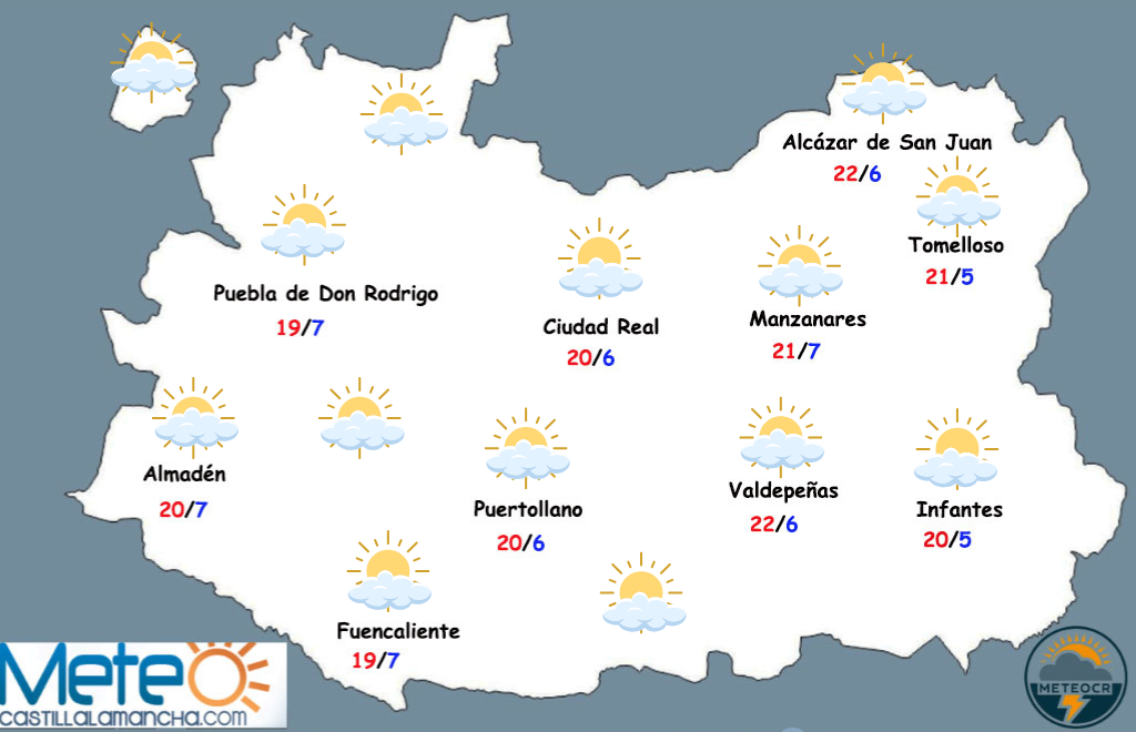 El viento soplará flojo con predominio de las componentes E/NE. Las temperaturas mínimas bajarán ligeramente y las máximas permanecerán con pocos cambios. Como en las jornadas previas, tendremos una gran amplitud térmica: