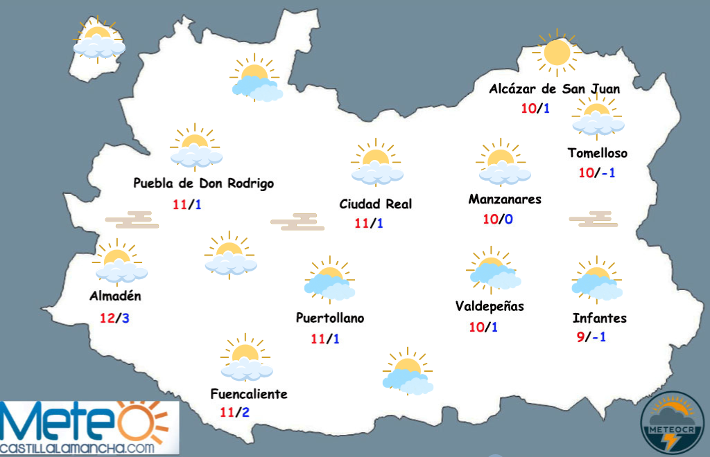 El viento soplará flojo, con predominio del oeste por la mañana y del norte a partir de media tarde. Las temperaturas van a descender y se podrían registrar heladas débiles puntuales. Las máximas también serán más frías, de 11ºC/12ºC: